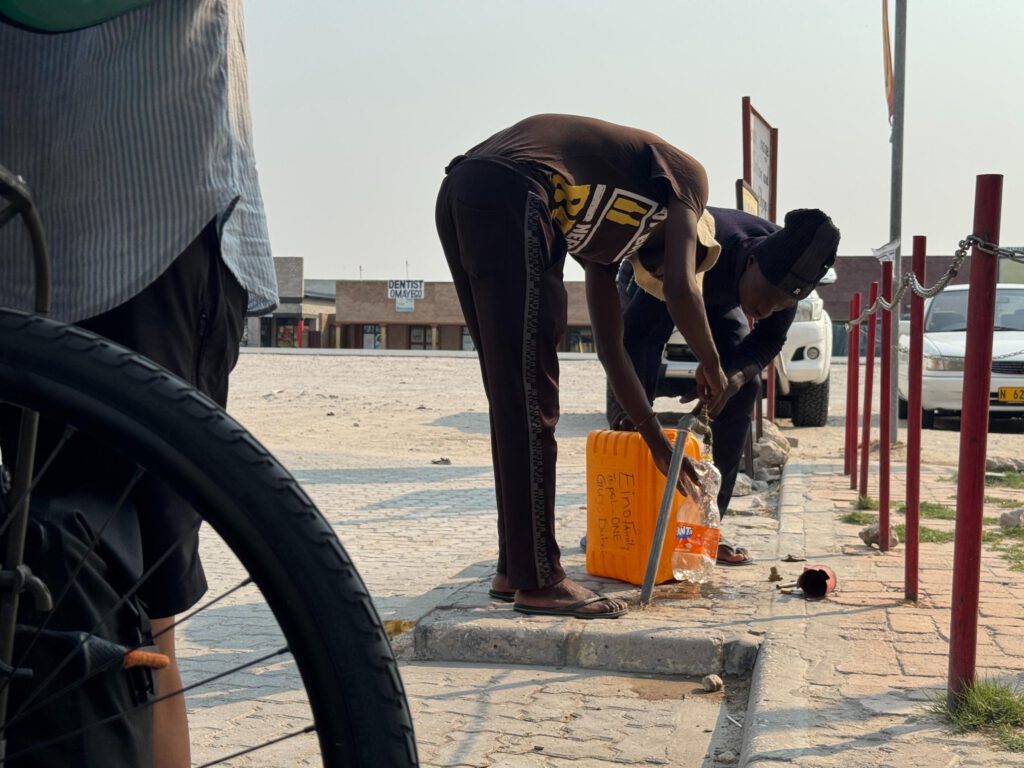 Con algo de energía en el cuerpo nos lanzamos a por más kilómetros. A diferencia de lo que hemos vivido hasta la fecha donde pasábamos etapas enteras sin poblaciones, esta zona está salpicada de pequeños poblados y ciudades más grandes más a menudo. La etapa no avanza mal, aunque a Sheila le ha bajado la regla y se nota más floja. Hacia los 44km hay una gasolinera con unas mesas a la sombra donde varias personas esperan a las furgonetas que les lleven a sus casas. Comemos algo de fruta y la gente de alrededor nos pregunta que hacemos y hacia donde vamos. Es curioso que en todos nuestros viajes, casi siempre te comentan que la gente del país siguiente es menos amable o alegre, pero hasta la fecha no ha habido muy malas experiencias en ese aspecto. Quizá la gente del norte de Namibia nos ha parecido más seria y más brusca. Repostamos agua, nos lavamos las manos en un grifo que hay en una pared de la gasolinera y que varias personas se acercan a usarlo, ya que no hay agua en el baño y el otro grifo tiene candado. Un hombre namibio se acerca y nos habla en español, trabaja para un barco pesquero que pesca en la zona de las Malvinas.