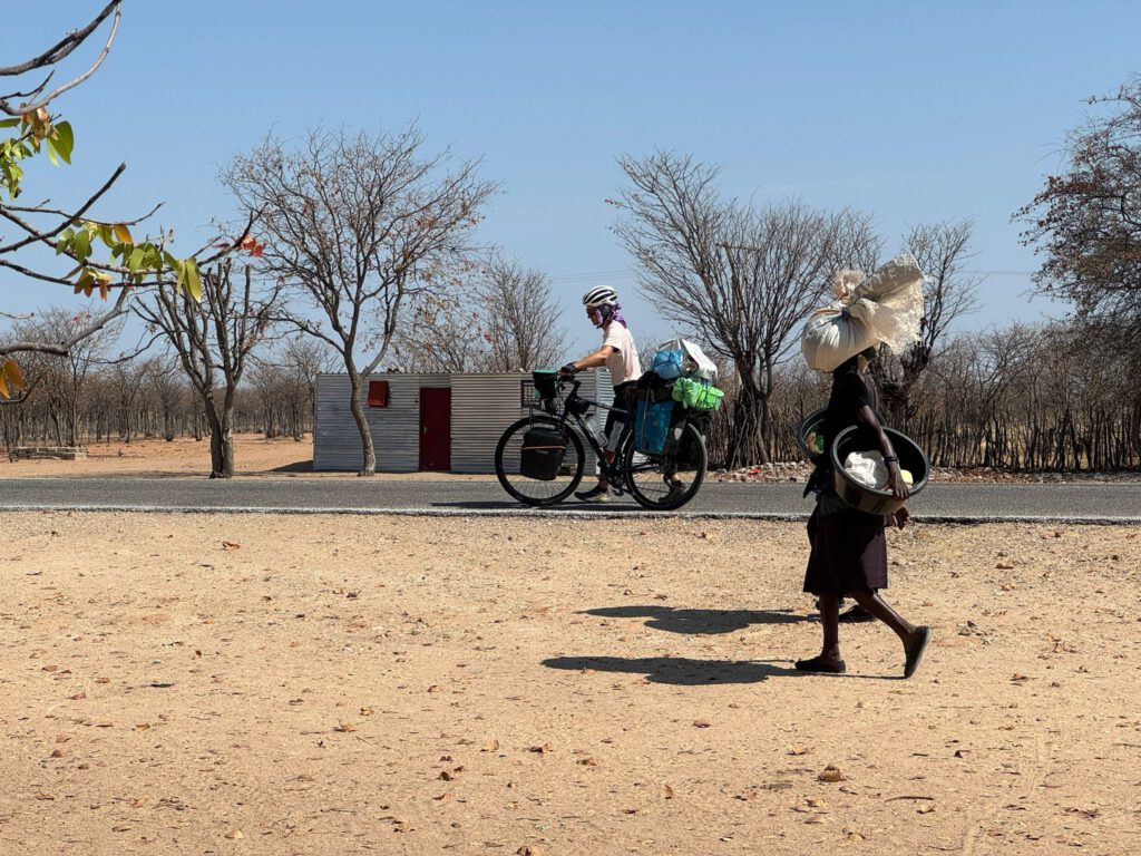 Conforme nos acercamos a Angola y nos alejamos de la Namibia turística y blanca cada vez las casas son más sencillas. Desde pequeños barracones de una planta nos saludan y gritan a nuestro paso. Si nos dieran un euro por cada saludo que lanzamos o devolvemos pagaríamos los pozos antes de terminar Rumbos. Hacemos una parada a mitad de etapa para grabar un vídeo para Navarra Tv, en breve serán los premios donde nos han nominado y tenemos que enviar nuestra presentación. Dos mujeres pasan con sacos de verdura a la cabeza y sonríen. En todo lo que llevamos de viaje por África no habíamos visto llevar cosas en la cabeza, con lo que ahora comienza otra África, donde detalles como esos están relacionados con costumbres que por la razón que sea no se dan en zonas donde hay más desarrollo.