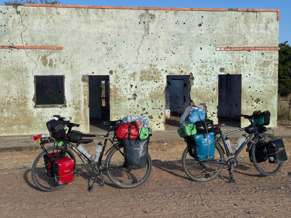 A las cuatro horas y media de polvo pisamos asfalto. Es domingo y cientos de personas regresan de misa con las sillas de plástico en las manos. Van elegantes, coloridas, contentas. Hay dos cajeros, uno roto y en el otro hay una cola inmensa. Una cola por la que se van sumando personas por los laterales con las ganas de sacar dinero antes de que se termine. La gente no sé que hace, se amontona alrededor de la pantalla y algunos tienen que meter códigos para que le den dinero con lo que se retrasa mucho, fácil estamos cuarenta minutos para mi turno. No es cerrado, es al aire libre y todos se quedan al lado de la pantalla para ver como saco dinero. Saco menos de lo pensado para que no alucinen con la cantidad. No puedo sacar más de 60€ de vez, así que saco en dos veces. De ahí, desandamos hacia la otra parte de la ciudad en busca de una tienda que me venda una tarjeta. Una tiene gente en la puerta y dicen que en dos horas volverá de misa y comer. No podemos estar dos horas esperando y comenzamos a marcharnos, uno de los hombres se levanta, le dice algo a un chico y viene en ese momento. Es el dueño que por lo visto no estaba tan lejos. Nos hace tarjeta rápido, pero el internet es una chufa y va por las justas. En frente compramos algo de fruta y nos vamos a las afueras del pueblo a comer unas sardinas con pan para meter algo al cuerpo. Hace mucho calor y nos refugiamos a una sombra. Justo en frente hay un control policial, que no sabes exactamente que hacen, pero paran a casi todos los coches. A nosotros también cuando nos vamos “de donde sois, a donde vais” ya podéis seguir, nos choca el puño y nos lanzamos a por los 30km que nos lleven a Chiulo. Ahora sí, rodamos a velocidad y se agradece, pero estamos cansados de la paliza del camino.
