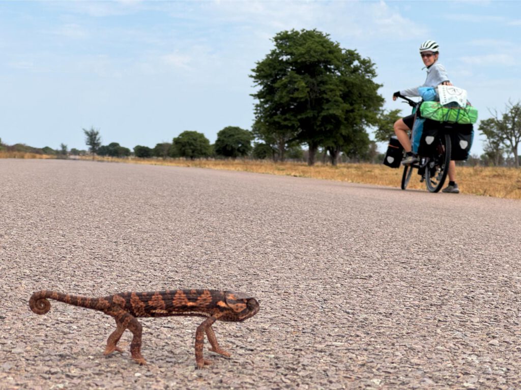 El perfil no va a ser extremadamente duro, pero los toboganes cada vez son más acusados y ganamos desnivel mucho más rápido que antes. El paisaje está seco porque salimos de una época sin lluvias, pero tiene mucha más vegetación y muchos árboles tienen hojas muy verdes que dan alegría visual. Por la carretera nos encontramos varios camaleones cruzando a pasos pausados, cada uno de un color, temes que cualquier coche los aplaste, pero por suerte hay poco tráfico. Grabamos a uno de ellos de cerca y emiten una especie de bufidos, acerco el móvil y con ello consigo que aceleren y se pongan a salvo.