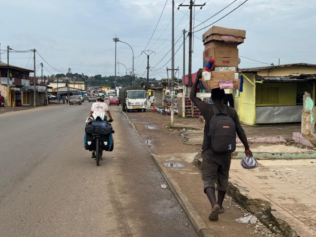 Hoy no hay mucho desnivel, pero las cuestas te obligan a subir piñones, rápidamente y bajar la velocidad mucho. En cuanto paras el calor sube proporcionalmente. Con el sudor se intensifica el picor de los fourous y de vez en cuando te dan arrebatos donde necesitas rascarte. La última parte pasa más rápido y pronto vemos Bifoum al fondo, es un cruce de caminos que lleva hacia el interior de Gabón, un camino de tierra por donde salen y entra decenas de camiones con árboles. Nosotros nos paramos en el cruce donde hay muchas tiendas de comida, ropa, y restaurantes. Nos metemos en uno, la presencia es la de siempre, paredes con marcas, manchas negras, suciedad. Mesas con hules de plástico con cubiertos encima. Una cocina minúscula con un hornillo de gas donde sacan decenas de platos al día, espagueti, arroz o tortilla con diferentes tipos de carne, vaca, pollo o riñones. Lo más caro es la tortilla, aquí los huevos son muy caros, vale menos un plato de arroz que la tortilla.