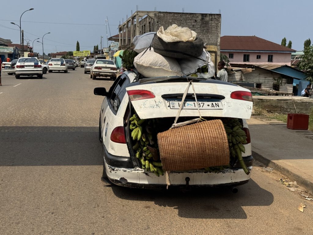 Desde eses desvío nos vamos acercando a Bata, hay algo más de tráfico y aunque baja hacia el mar, hay más cuestas de las esperadas. Pronto comenzamos a ver semáforos, negocios, gente, puestos callejeros, ruidos y tubos de escape que llenan el aire de humo negro irrespirable. Vamos a casa del hermano de Antonio, vive cerca del cruce de Dar. Antonio no supo ubicarlo en el mapa y su hermano no supo mandar ubicación, así que toca preguntar. Las indicaciones son nefastas y hacemos cinco kilómetros de más por calles que parecen una montaña rusa. Toca preguntar cada quinientos metros porque sólo saben decir tira recto y pregunta más adelante. Ahora vamos por calles estrechas con mucho tráfico de taxis y gente. Hemos dejado atrás nuestra selva y quietud. En un momento dado nos señalan una calle diferente y la seguimos hasta lo que parece el cruce de Dar y un grito “Xabi” nos obliga a buscar su procedencia. Es un señor que estaba esperando sentado desde que le he escrito al entrar en Bata. “¿Dónde estabais?”, nos han mareado. Le seguimos por un camino de tierra a la casa familiar. Un lugar con varias casas de cada uno de los hermanos. Nos abre la de Antonio, y nos muestra nuestro cuarto, tenemos hasta cocina. Agua no hay, hay que rellenar cubos del pozo. Ya son muchas de las ciudades donde hay instalación de grifos, pero sin agua. Toca rellenar los baldes para ducharnos, lavar ropa, tirar de la cadena y fregar.