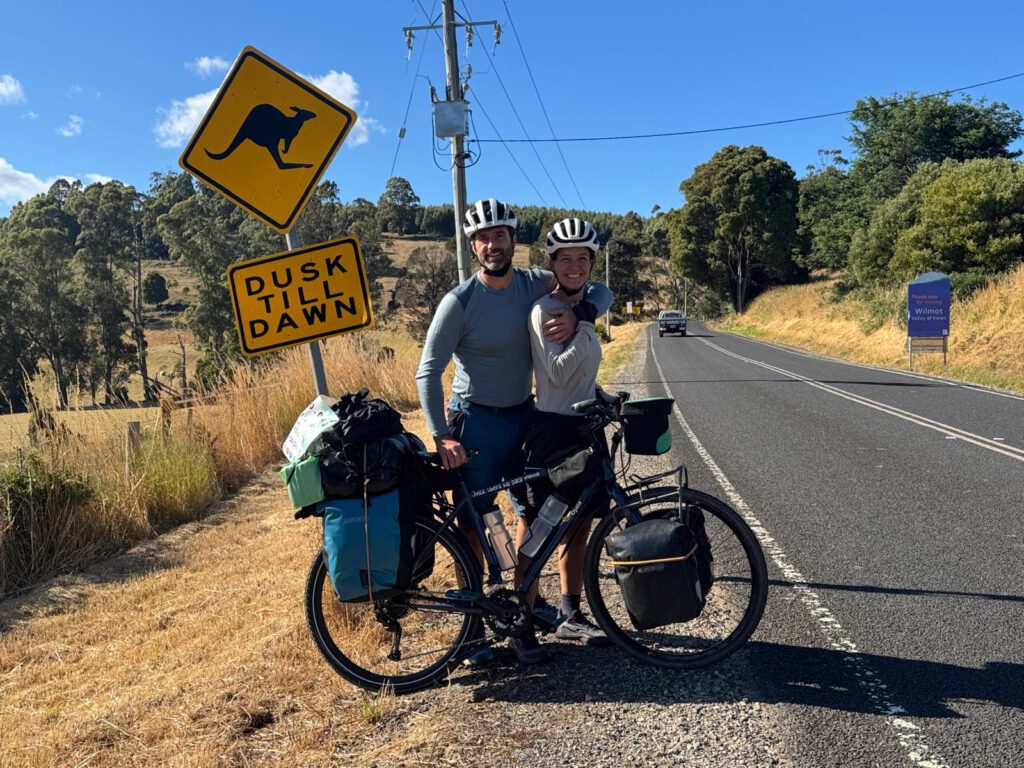 A los pocos metros vemos un cartel de cruce de canguros, esa señal sólo la veremos en este país, de hecho muchas de las señales de animales que veremos, wombats, wallabies, demonios de Tasmania, koalas… sólo están aquí, la evolución ha seguido un curso muy diferente en esta parte del planeta y es increíble. Nos hacemos la foto de rigor y comienza la subida. Hoy tenemos 43km con 1200+ y no va a ser fácil. Vamos de manga larga, pero el viento hoy juega en nuestra contra con temperaturas bajas con lo que no deja entrar en calor del todo. Por lo menos da el sol y se agradece. El paisaje a ratos se abre a la inmensidad de bosques de eucaliptos y otros árboles que no desciframos. Volvemos a ver un muchos wallabies por la carretera. Y la primera subida acaba con un kilómetro al 18% que saca lo mejor de nosotros y en concreto baja de la bici a Sheila. A los 10km llevamos 500+ y deseamos que el perfil programado cumpla y no siga ese ritmo. El cuerpo nos pide comer, pero es pronto, en ocho kilómetros hay una cafetería y la marcamos como parada del día.