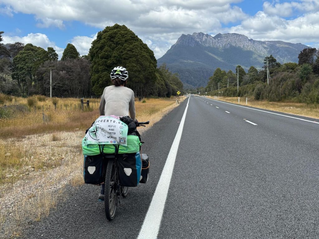 El paisaje sigue asolado, con grandes claros y árboles desnudos por el clima. Tras una subida suave de cinco kilómetros bajamos un poco para afrontar las rampas más duras del día a 16% y terminar de calentarnos del todo. Ese será el punto más alto del día desde el que veremos los dos valles. Pero las nubes y el color gris le quitan vida a la vista. Nos abrigamos para bajar y desde ahí comienza un perfil de toboganes que miran hacia abajo en los que poco a poco va saliendo el sol y nos permite disfrutar del paisaje. Hoy además de wallabies en la carretera vemos un par de oseznos muertos. Imagino que estar acampado y ver osos, tiene que ser un susto grande, habrá que andar con cuidado. Me parece increíble poder ver tantos animales diferentes en una misma isla y tan peculiares.
