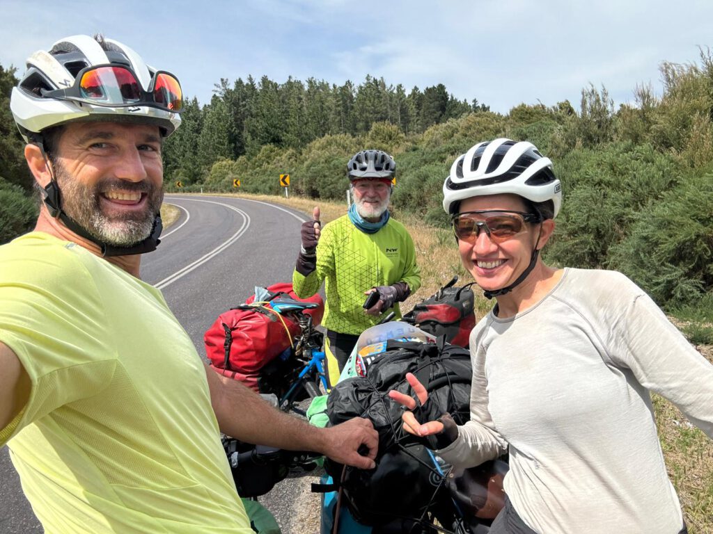 En una de las curvas nos cruzamos con un señor de 73 años que viaja en bici, Detlevs Sowoda. Un alemán afincado en Perth que ha viajado desde 1990 por decenas de países en bici. Lleva la bici igual de cargada que nosotros, pero muchos años más. Un hombre canoso, con una barba poblada, piel arrugada y curtida, ropa de bici dada de sí de tantos usos. Nos cuenta todo lo que ha hecho y sus planes de futuro y da envidia la energía que tiene. No sé si seré capaz de afrontar estas cuestas con treinta años más. Además tiene viento en contra. Casualmente ha dormido en la casa a la que llegaremos y nos da un abrazo para Dianne.