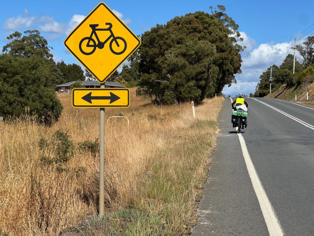 Desde que salimos de Scottdale, tenemos cuatro subidas como objetivos y todas en los 18km finales. Hasta ahí rompepiernas. Vamos pasando campos de cereal secos con sus pacas circulares gigantes, pastos llenos de vacas y hoy a pesar de lo que nos había dicho Carlos, muy pocos animales muertos, pero seguimos la línea. En esta zona han sido más possums. Tampoco hemos comido mucho, un sándwich y empezamos a tener hambre, paramos antes de todas las subidas. En Australia casi no hemos visto autobuses o transporte público. Eso implica dos cosas, que si eres extranjero y quieres moverte, o alquilas vehículo o tienes pocas alternativas. Hay otra implicación y es que si no hay autobuses, tampoco paradas con sus techos de resguardo y suelen venir bien para parar a comer. En un país donde casi todo son fincas particulares, es difícil encontrar un sitio cómodo para parar en la carretera, luego en los pueblos hay zonas de acampada, pero en esta zona de la isla hemos visto pocas. Así que paramos al lado de unas balas de heno enormes a resguardo del viento y comemos un par de plátanos y cacahuetes con el sonido de las vacas y de la paja al viento.