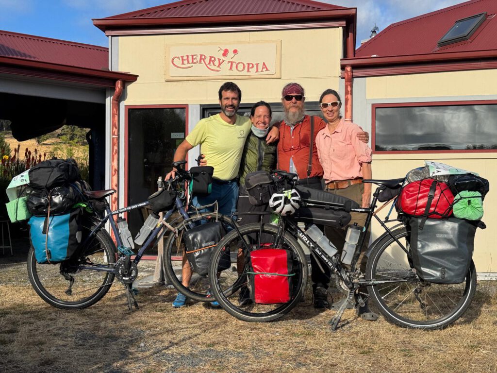 Bajamos por el camino de su finca, “Cherry topia”, es un gran recuerdo para nuestra vida. No vamos tan abrigados como otros días y además la etapa, excepto ese kilómetro que se nos atragantó para terminar la etapa anterior, comienza subiendo. Tenemos unos 17km que van picando para arriba y a momentos, con rampas que nos avisan que no hemos estirado en los dos días en la granja. Acumulan cansancio, malos estiramientos y quizá saber que pronto descansaran un buen rato. La primera parte hasta el alto es entre bosques y se nota que llegamos a la segunda ciudad de Tasmania, Launceston, porque hay bastante tráfico y con menos caravanas, es más de utilitarios que van a trabajar. La ciudad con sus barrios es grande y estamos casi 15km atravesándola. Por suerte hay un carril bici que nos aleja un poco del tráfico y justo cuando volvemos a la carretera hay una manifestación por Palestina. Nos acercamos y el hombre con el que hablamos es Palestino, su padre tuvo que salir con la Nakba en el 48 y el nació en Bagdad. Conversamos un buen rato sobre nuestra experiencia en Palestina, sobre nuestra lucha, sobre lo mal que está el mundo y nos ofrece dormir en su casa, pero nuestro campamento está a 52km de ahí y tenemos que rechazar la oferta. El grupo es pequeño, unas veinte personas y todos muy mayores, necesitamos relevo generacional y más gente, sobre todo.