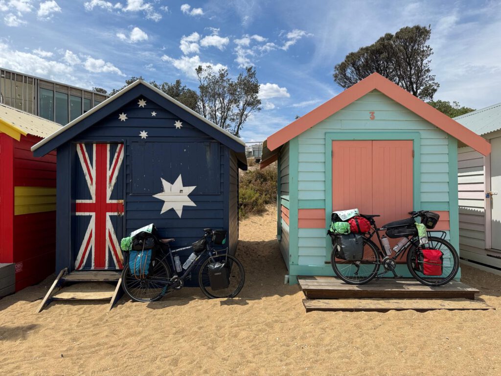 Poco más adelante llegamos a Albert Park, un gran parque natural en la ciudad donde durante el año se juega a beisbol, es zona de esparcimiento, pero que en breve alberga el primer gran premio de formula uno de 2026 y están montando las gradas y todos los accesos. Dentro de poco la ciudad tendrá un gran evento que modificará gran parte del centro. Desde ahí nos vamos hasta la costa y vemos el mar de nuevo. El día es muy venteado, pero por fin el viento da a favor y pedaleamos por toda la costa. Hay muchas playas, no están muy llenas. Mucha gente haciendo kite surf. Casas enorme con vistas al mar, parques, por momentos hay tanta vegetación que parece que estás a las afueras de la ciudad. Hay mucha vida y en unos días iremos a visitarla, hoy toca llegar a casa después de un mes en bici y hay ganas. Antes de desviarnos hacia nuestra calle, nos acercamos a las famosas Birghton beach boxes, casitas de colores donde la gente guarda sus cosas de la playa y que la gente va para hacer la foto de rigor. Son muy parecidas a las que tenemos por el norte de España, pero esto es Melbourne y tienen un poco más de renombre. Tras la foto de rigor de fin de etapa oceánica enfilamos los últimos cinco kilómetros hasta nuestro barrio.