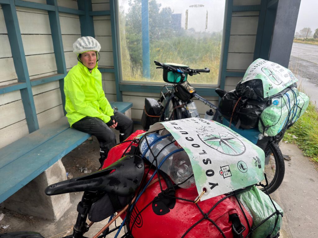 Primera noche que descansamos bien y se nota al despertarnos. Aprovechamos la cabaña para desayunar tranquilos mientras al otro lado del cristal la lluvia no cesa desde hace horas y esa es la parte que nos preocupa. En una sala de seis metros cuadrados está la cocina, la mesa con cuatro sillas, las dos bicis y un tendedero con toda la ropa del día anterior secándose. Desayunamos con pereza de recoger todo y de salir a un día nublado. Mientras recogemos el cielo nos da tregua y nos permite salir afuera a montar las bicis sin mojarnos. Pero nos abrigamos como hacía mucho que no lo hacíamos. Perneras, chaqueta, cortavientos y buf, el kit completo.