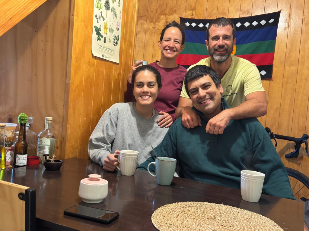 El perfil va subiendo ligeramente y en un desvío, en google maps me dice que el camino es de tierra, pero las aplicaciones dicen que es asfalto. Confiamos que no esté actualizado google, pero las que fallan son las aplicaciones y nos comemos 13km con subidas por caminos de gravilla que nos baja mucho el ritmo y sobre todo nos acumula mucho cansancio. En Chile ya llevamos cinco etapas con caminos que no son muy cómodos. A punto de llegar a la carretera, en Malihue, hay un puesto de salud donde descansamos un poco. Nos recuerda mucho a las atenciones que hemos hecho en los proyectos, con una casita muy sencilla que atiende a gente muy humilde que trabaja en el campo. Conversamos con un chico de los problemas de la zona y de nuevo sale el tema del agua y la falta de potabilización. Consigo mandar un mensaje a la cabaña donde dormiremos, pero la cobertura no es muy buena.
