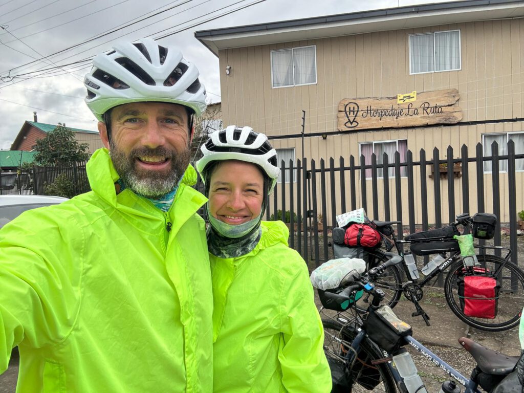 Tenemos unos pocos kilómetros de ciclovía, hoy la etapa ha sido pequeños oasis de asfalto y mirando constantemente el gps, se nos ha hecho eterna. Aunque hubiera hecho bueno habría sido una etapa fea, pero que te adelante camiones que arrastran una nube de agua y te mojan entero no es nada placentero. El acceso a los Ángeles se tensa porque llegamos a la ruta 5, que es la arteria principal del país y aumenta el tráfico. Pasado ese escollo comienzan obras para añadirle dramatismo al día. Lo peor de todo es que algunas ocasiones algunos coches te pitan para que te apartes. Si yo fuera en un coche, lloviendo, en una carretera con tráfico y viera a unos ciclistas sufriendo fuera, mi reacción sería de compasión, no de “aparta que me frenas”. Tras tres horas de trabajo mental la avenida Padre Hurtado es un remanso de paz, quedan sólo 3km hasta nuestro hospedaje. Ahí nos espera Pedro, el dueño, de abuelos de Getxo, en cuanto vio lo que hacemos no dudo en ofrecernos una habitación gratis. Tiene una finca, varias casas viejas que está demoliendo y en una que ya ha levantado al fondo hay un barracón con dos baños y cuatro habitaciones. El deseo es ducharnos y entrar en calor, pero en días como estos, desmontar las alforjas, limpiarlas y secarlas para meterlas en el cuarto, lleva más rato de lo que uno querría.