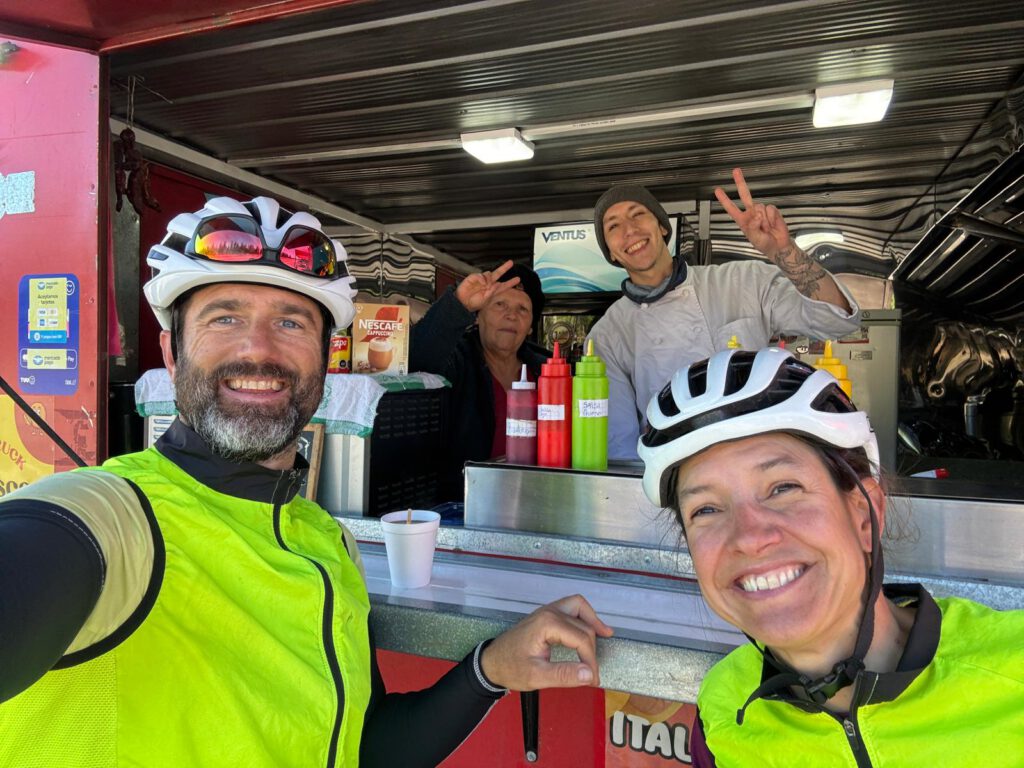 Antes de dejar la vista del Volcán a la derecha para ir hacia Yungay paramos en una zona donde hay varias señales de carretera artificiales con mensajes religiosos: “No siga sin Cristo”, “Queda un día menos para la llegada de Cristo”, “sigan por este camino, Dios les ama”… un festival de señales en diez kilómetros de carretera a cada cual más bizarra. Lo que me extraña es que la jurisdicción les deje ponerlas. Primero porque desvían la atención del conductor hacia mensajes que no son de circulación y segundo porque si cada uno quiere dejar su mensaje, convertimos la carretera en un panel publicitario personal. Ahí nos damos cuenta que llevamos más o menos la mitad de la etapa y hay un foodtruck, no es mal momento para parar un poco y tomar un café caliente. Son una madre y su hijo que lleva desde las 6:30. Salen adelante, pero no es un lugar fácil. Se les ve super humildes, buena gente. Nos hablan de dos chicas que conocieron hace tiempo que viajaban con un perro. No nos lo podemos creer, son las venezolanas que conocimos semanas atrás y que justo han pasado por esa carretera y han parado en ese foodtruck, “El rojito”. Les mandamos mensaje en ese momento y les alegra el día. Pedro y su madre Bernarda alucinan con nuestro proyecto, nos invitan a dos sopaipillas (pan con masa de churro frita) y charlamos un buen rato con ellos. Cómo echábamos de menos poder tener días soleados y poder parar a conocer a la gente, sin tener ganas de acabar la etapa.