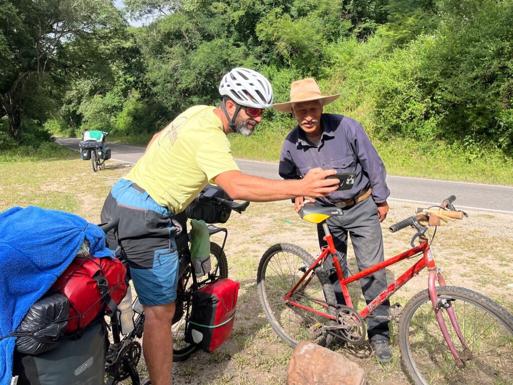 Salimos a la ruta 9, ya nos habían avisado que es una carretera de curvas famosa para bicis y motos. Y poco a poco vamos subiendo por un paisaje tropical. La cabeza en este viaje está acostumbrada a cambios, pero más sutilmente, no tan brusco. Si nos dicen que hemos entrado en la selva de Ecuador por accidente nos lo creemos. Es una de las etapas más bonitas en mucho tiempo, por lo menos este trozo. Nos cruzamos con varios moteros y en una de las curvas que hay vistas a otro embalse hay unos brasileños haciéndose una foto. Casualidad dos de ellos en un mes van a hacer el camino de Santiago en bici y pasarán por Pamplona. La cultura de moteros y mundo camper en Brasil es enorme. Ellos van hacia Jama, ahora les llega lo bueno. Mientras hablamos pasa un señor en bicicleta, es mayor, con un gorro de vaquero. Es muy fotogénico, pero sigue camino y pierdo la foto. Nos despedimos de los brasileños y seguimos subiendo y justo en una de las curvas veo al vaquero. Está buscando algo entre los matojos. Es un señor de setenta años, con tez morena, bigote blanco y sonrisa. En el manillar lleva un tirachinas y me muestra como lo usa. Está en muy buena forma. Nos deja muy buena energía y seguimos subiendo por la jungla. En los 27km nos paramos de cruzarnos con moteros. Hemos perdido la cuenta de todos los que hemos visto desde que llegamos a Chile, pero para lo caras que son esas motos, me parecen muchos. Y no van para unos días, muchos te cuentan que llevan meses viajando. Casi a los 30km llegamos a los más alto del día 1.600 metros. Hace unos meses en Turquía alucinábamos por subir hasta esa altura y ahora casi nos parece bajo.