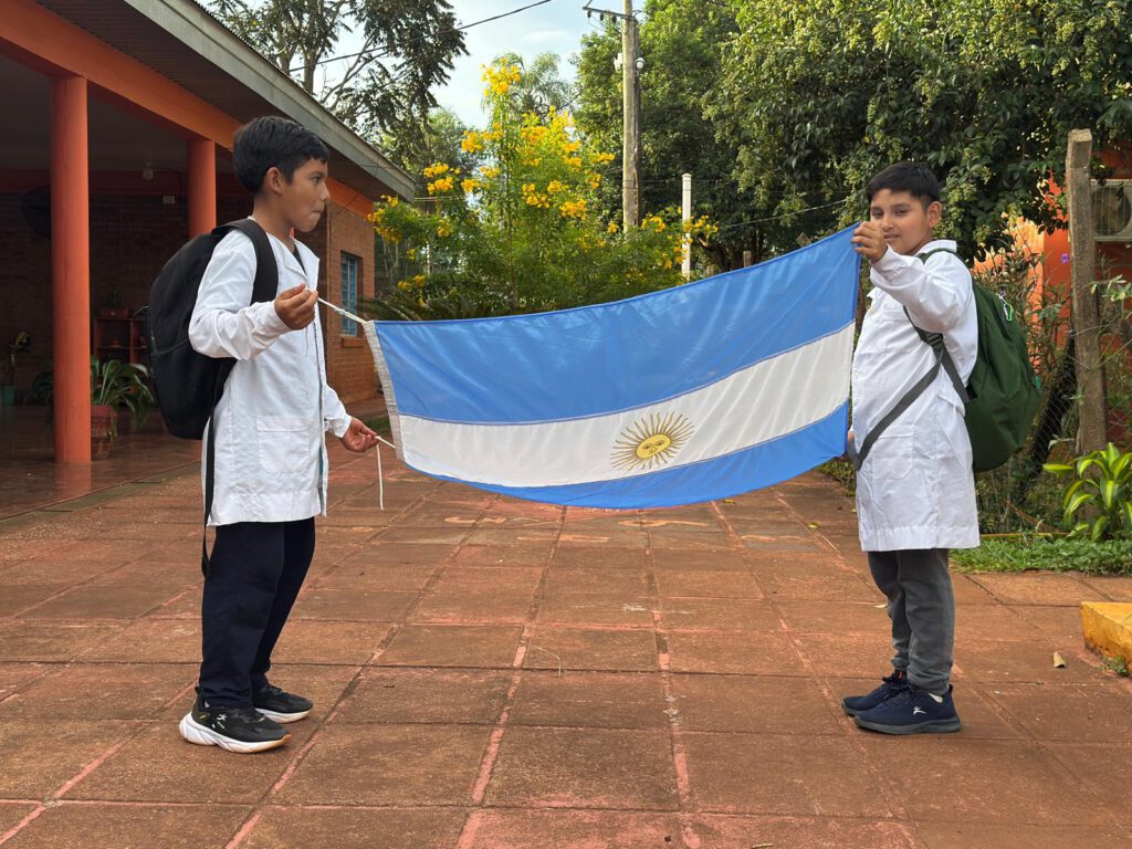 En el cole, mientras comemos los bocadillos, los niños salen de clase, nos saludan. Tienen ganas de hablarnos. Forman para bajar la bandera, pero antes la directora nos da la palabra y les contamos lo que hacemos. Después descuelgan la bandera mientras rezan el himno. Gloria y las profesoras se van y nos dejan solos. A la tarde con jarras de agua calentada en la ketel nos duchamos y hacemos la tarea antes de que venga Andrea, una de las profesoras. Nos ha invitado a su casa, pero la directora prefiere que nos quedemos ahí, ya que todo está abierto. Le hacemos la cena y nos quedamos charlando hasta bien tarde. Así que hoy toca dormir poco, que las profesoras vienen a las 6:00.
