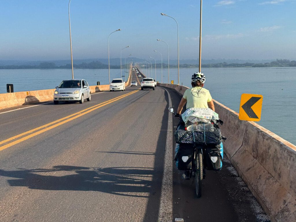Guaíra es la última ciudad de Paraná y entramos en Mato grosso do sul, lo hacemos por el puente Ayrton Senna que tiene 3,5km de largo para cruzar el río Paraná. Esta zona es muy tranquila, no sé en época de lluvias, pero ahora invita a sacar una piragua y remar cada amanecer. Hay varias barcas de pescadores. La cosa es que casi no hay arcén y el tráfico es intenso y toca estar atento. Pienso en como sería este puente en Australia, sería una obra de ingeniería super moderna con carriles para las bicis. Aquí va unos diez metros por encima del agua y es muy sencillo. Tienen farolas a lo largo del puente y caemos que no lo hemos visto de noche. Imagino que habrá muchos días que no se verá la otra orilla de lo lejos que está.