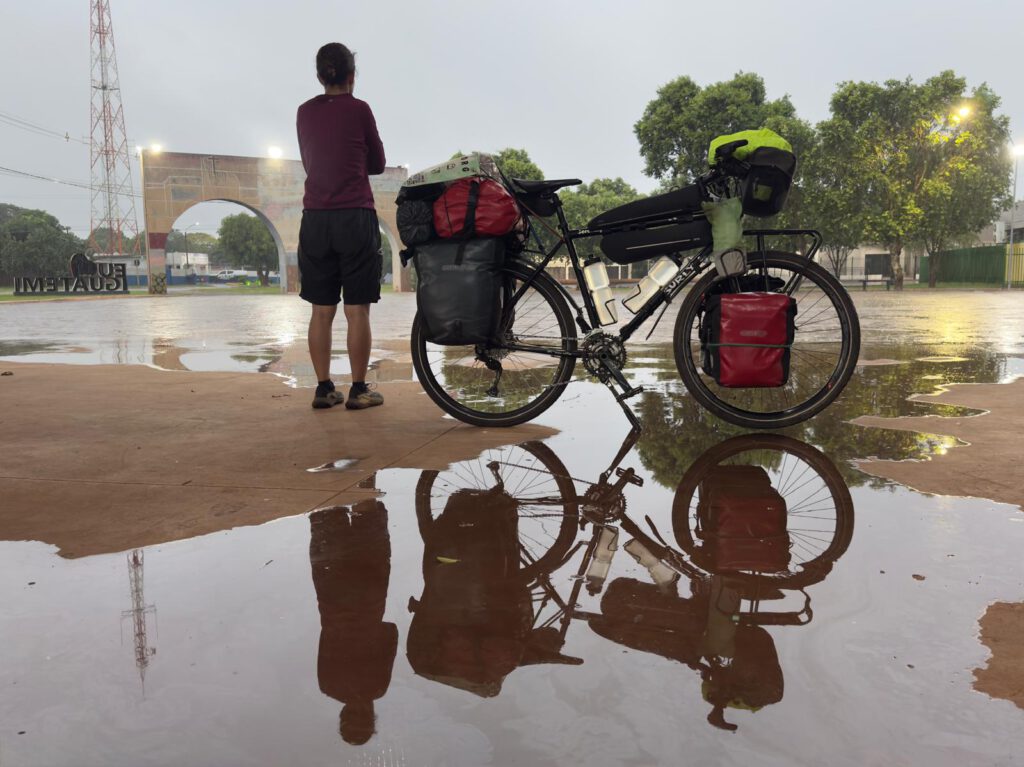 Paramos una vez a comer unos plátanos, pero duramos poco, las moscas del cereal nos rodean y son muy pesadas. Desde ahí nos quedan unos 20km que no tienen mucha historia ya que tenemos ganas de llegar y secarnos del todo. La pena es que a falta de cinco kilómetros se pone a llover de nuevo y nos moja toda la ropa de nuevo cuando casi estábamos secos. La entrada en Tacurú son tres arcos con loros gigantes y una recta hasta un pueblo que parece abandonado. Es verdad que es domingo, pero no hay un alma por la calle. Vemos un hotel, la señora no esperaba visita porque le cuesta reaccionar y eso que se nos ve mojados de arriba abajo. Negociamos un precio con desayuno, 26€, no contábamos con ello, pero tenemos lluvias aseguradas. Descargamos todo, metemos las bicis, buscamos un supermercado abierto, pero no hay nada. La calle está vacía y parece un capítulo de “The walking dead”. Hasta el hospital y el polideportivo parecen un escenario de Chernobyl. Regresamos a casa, comemos el arroz que teníamos de la noche anterior y lavamos la lona y ducha caliente para entrar en calor.