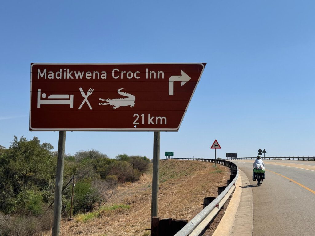 Seguimos etapa hasta Groot Marico. El viento en contra no cede y además el perfil ahora es de toboganes, subidas tendidas que se hacen eternas. Tenemos una bajada larga que nos da un escenario completo del paisaje, lomas suaves de vegetación conífera y arbustiva. Continúan las vallas y de vez en cuando aparecen reservar donde poder acampar, la cuestión es que ahora los animales que puedes ver en ellas son girafas, cocodrilos, antílopes. Ya estamos en África y una de las cosas que destacan es la diversidad de animales que para nosotros sólo aparecen en libros y el los documentales, una fauna salvaje que iremos viendo a lo largo del continente y que es fascinante. Aunque algo cansados vamos a buen ritmo y pronto llegamos a una gasolinera donde pararemos algo más para comer. Todos los trabajadores son negros y casi todos los que vienen en todoterrenos enormes son blancos, la brecha de clase es evidente. En una sombra comemos los bollos con embutido y una de las chocolatinas que nos dejaron los niños en la mesilla la noche anterior. Tras una hora de descanso salimos a la 13:30 del refugio de la gasolinera a un sol que ahora abrasa, no hace excesivo calor, pero la radiación es muy fuerte y la piel pica. El viento cede, pero las subidas no, y poco a poco se va notando la etapa en las piernas.