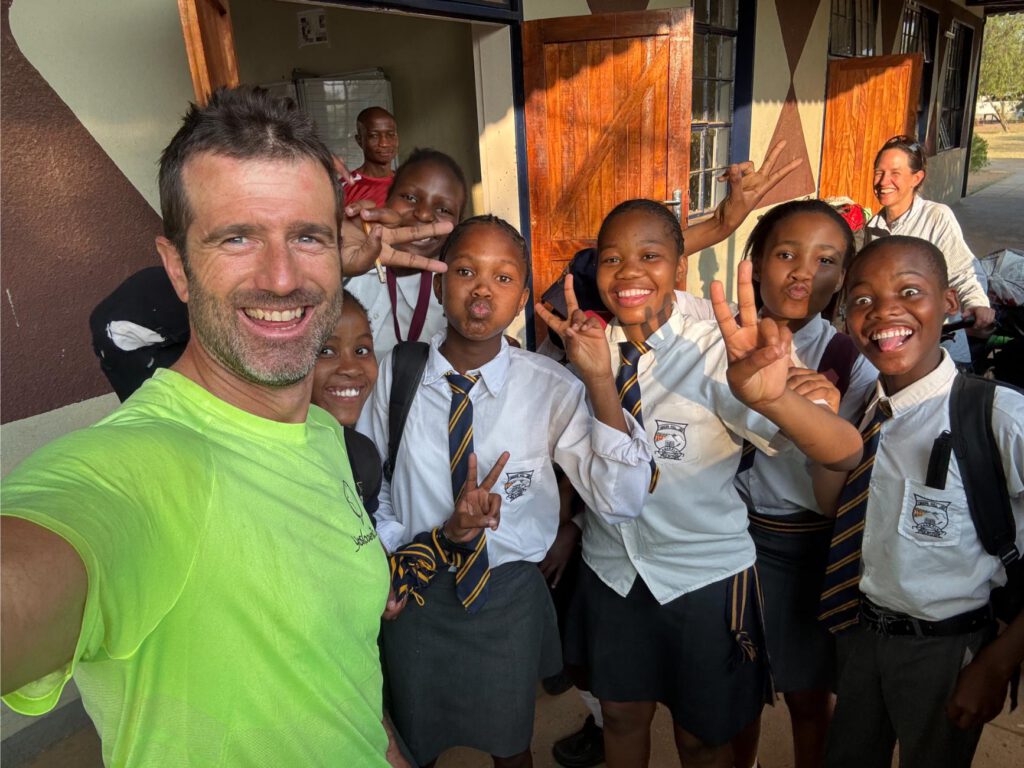 Combustible en el cuerpo y a por la frontera que está a 20km, aunque el desnivel acumulado es escaso, la sensación es de estar todo el rato ascendiendo, también es verdad que el viento en contra no ayuda. Un edificio enorme estilo safari es la aduana de Sudáfrica, varias mujeres que trabajan ahí se interesan por nuestro viaje y se hacen fotos con nosotros. La gente en África es muy alegre y les encanta posar cuando les haces la foto. Nos dan agua, sellamos el pasaporte y nos vamos con una sonrisa en la cara. En la frontera con Botswana primero nos hacen mojar las ruedas en el mismo liquido que pasan los camiones, luego pisar los pies en un desinfectante, no creo que esas medidas eviten nada, ya que el agua está negra y la alfombra igual, pero es su protocolo e imitamos al resto. El edificio de frontera es gigante, choca con la realidad del país. El trámite es algo más lento, pero salimos con el sello del país 19 del viaje.