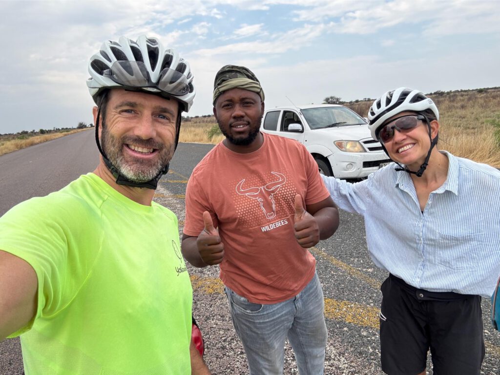 Al salir de Mabutsane entramos en 63km sin anda, rectas de sabana sin pueblos. La falta de pueblos hace que siempre podamos ir en paralelo charlando y lo disfrutamos para cuando lleguen carreteras masificadas. Al poco de comenzar una furgoneta nos adelanta lentamente y se detiene a lo lejos, no sabemos si le ha pasado algo o es por nosotros. Al llegar un chico espera fuera con dos refrescos. Se llama Kheisi, arregla extintores y al vernos nos ha querido ofrecer algo. Seguro que el día de más calor cuando no llevemos doce litros de agua encima no se parara nadie. Cuando le contamos que estamos haciendo saca cien pulas, unos siete euros (contando que el salario medio es de 500€ mensuales, aunque seguro que hay personas que ganan mucho menos).