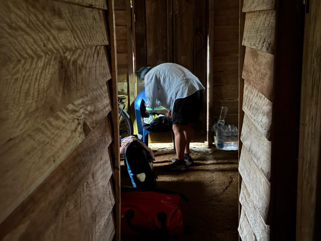 La primera etapa en Guinea ha sido una de las más duras del viaje. La falta de información en google maps y las indicaciones erróneas de la gente local hacen que una etapa larga, sea eterna. Saber que hsólo hay un pueblo en esa carretera, que hay elefantes que atacan a la noche, nos obliga a seguir hasta encontrar Nviayong. Cansados pero llegamos. Ahí el jefe del pueblo nos deja dormir en la casa donde se aloja el cura cuando va a dar misa. Suelo de tierra con olor a patatal, tablas de madera, ratoncitos, estamos como en la calle, pero a cubierto. Al día siguiente nos levantamos pronto, porque la etapa vuelve a ser dura hasta Acurenam. Nos despertamos con los sonidos habituales de África.
