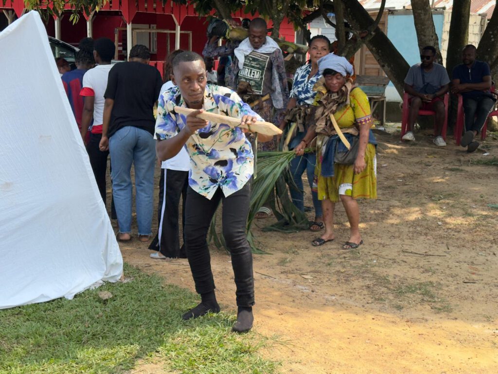 Estamos en Bata, nuestro último lugar en Guinea Ecuatorial, no es la capital, pero si la ciudad más importante del país en el continente. Ahí pasamos dos días en casa de Alejandro el hermano de Antonio el cura que nos acogió en Acurenam. El primer día vamos a comer cerca de la playa y el taxista es muy amigable, charlamos con él y resulta que vive justo en el barrio que vivimos. Al día siguiente, desde casa escuchamos percusiones, sermones, canciones durante toda la mañana, cuando salimos de casa, algo se representa. Ahí está el taxista, que forma parte del teatro, nos invita a verlo, a grabarlo, no sabemos que quieren contar, pero es bonito ver a una comunidad participar unida del relato oral.