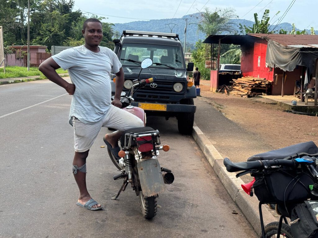 Hemos dormido en casa de Josh en Mandilou, queremos llegar a Lambarené en una etapa larga. La carretera es de las más bonitas que hacemos en África. A los 10km hacemos los 3.000km en el continente en Fougamou, ahí aprovechamos para comprar pan para la etapa. Mientras espero a que salga del horno, un chico local llega con una moto, no apaga el motor y tiene un sonido constante. En Gabón hemos visto muy pocas motos, llegando de Congo y sobre todo de Angola, donde casi hay tantas motos como personas, ese sonido se hace casi extraño.