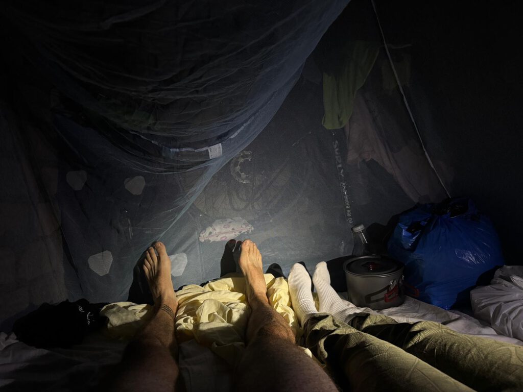 Es un pueblo humilde, la iglesia está en construcción y nos ofrece unos cuartos que hay en la trasera para viajeros. Hay unas chapas para ducharnos y todo parece muy favorable. Pero los cuartos son de 2×2 literal, lo justo cabe la cama y son habitáculos uno seguido de otro construidos con adobe y techo de chapa. Hace mucho calor dentro, conseguimos una mosquitera que clavan en la estructura de madera. El suelo es de tierra y cuando nos hemos duchado metemos todo como un tetris, bicis incluidas subidas sobre las alforjas. A la hora de ir a la cama hace mucho calor y sudamos sin parar, pero nos dormimos de puro cansancio. En mitad de la noche escuchamos ruidos, parece que es el perro que merodeaba la noche anterior que esta mordiendo la botella de plástico que había en el suelo, pero es dentro, es nuestra bolsa de comida y una rata mordisquea el borde. Encendemos la linterna, huye, pero el daño está hecho. No ha llegado a la comida y la metemos dentro de la cama. El resto de la noche son las ranas, de nuevo las ratas en nuestra cabeza, los gallos antes de amanecer o un perro apaleado por los chicos locales para separarlo de una perra con la que se ha quedado enganchada. Ha sido una noche larga de muchos sonidos y aunque con sueño, nos alegramos de salir y montarnos sobre la bici.