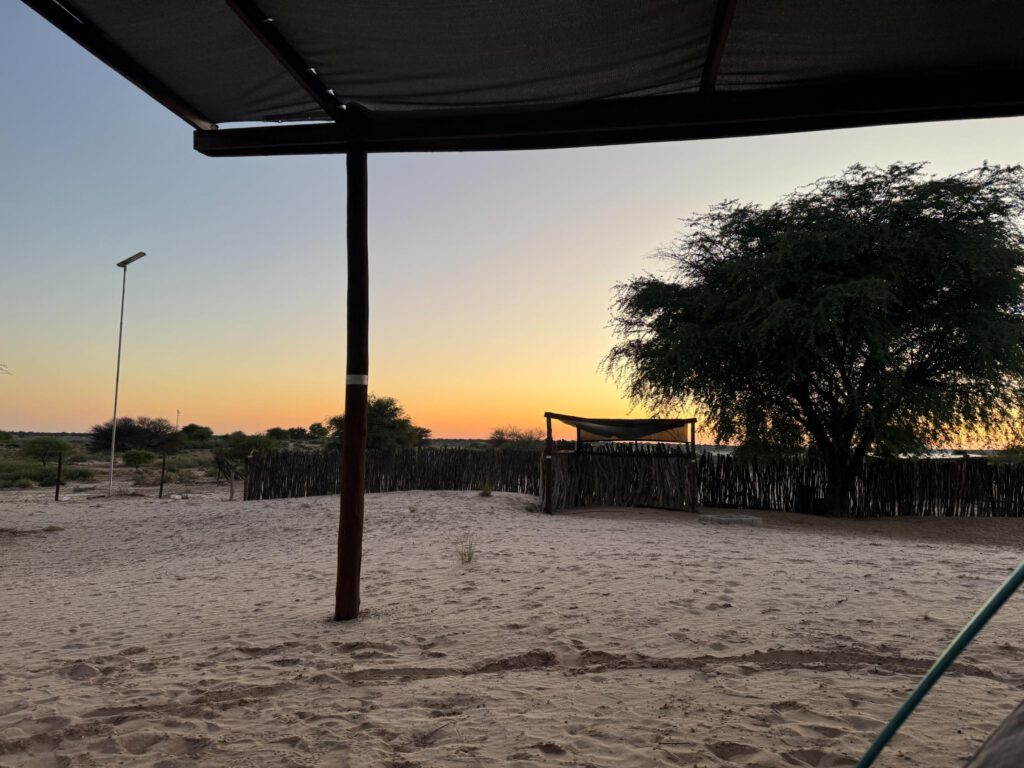 La etapa 94 nos mete de lleno en el desierto del Kalahari, nosotros en la parte de Botswana desde Hukuntsi a la que se llama «la puerta del desierto». La realidad es que abarca 900.000km2 de varios países. El día transcurre por caminos y por momentos no sabemos si seremos capaces de llegar a Zutshwa, pero con paciencia y cabeza conseguimos llegar al campamento. Al anochecer los pájaros regresan al refugio de los árboles y se escuchan las conversaciones que hay en todos los que tenemos alrededor. Me acerco sigilosamente para ver si puedo grabar algo. Los de mi árbol se callan y tengo que pasar un buen rato quieto hasta que comienzan a emitir sonidos, mucho menos que antes de acercarme, pero lo suficiente para sentir la naturaleza.