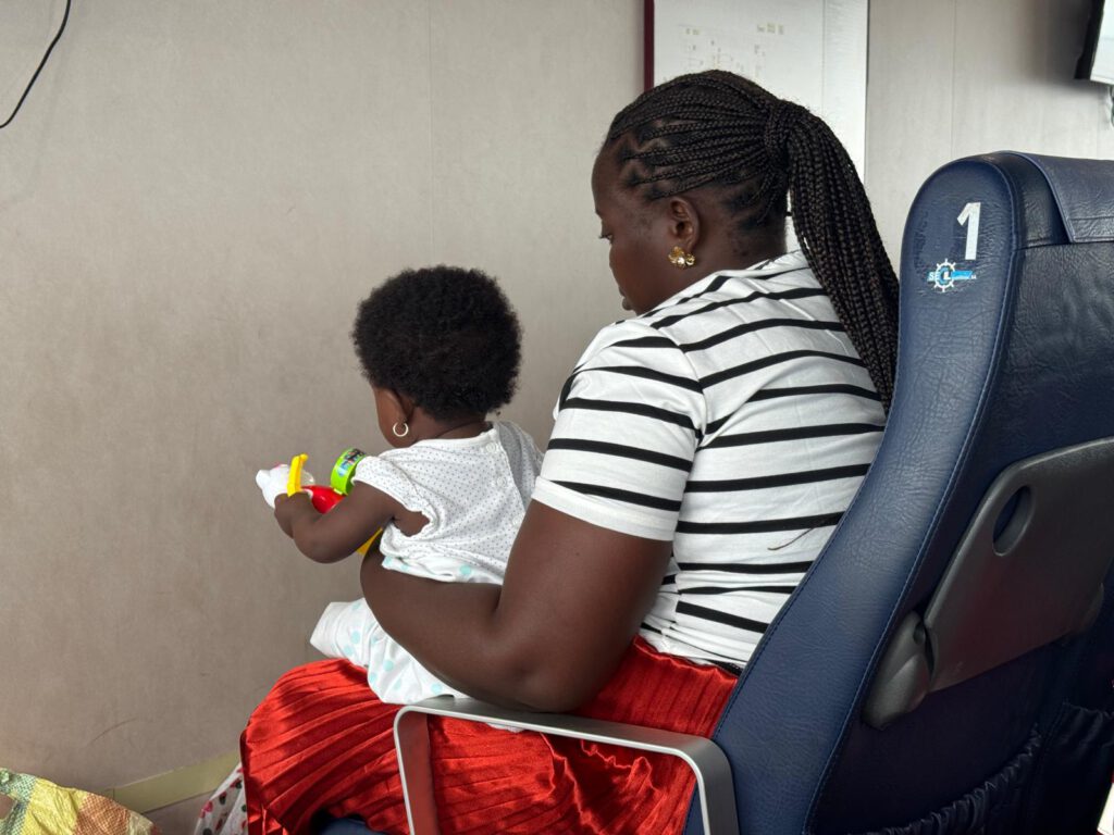 A las 6:00 de la mañana vamos puntuales al ferry, ya hay una cola inmensa de personas esperando para pesar sus bultos. Como vamos en bici, asumimos ser vehículo y adelantamos la cola y tenemos suerte nos dejan pasar de los primeros. Pesamos todo y esperamos en la sala de embarque, tres horas hasta que el motor se pone en marcha. El barco se llena para ir de Soyo a Cabinda, los vuelos son caros y el de Luanda está roto con lo que es difícil encontrar asientos. Aunque es corto el viaje, los niños lloran y las madres tratan de entretenerlos con juguetes que resuenan por el espacio. el madrugón de todo el mundo hace que la gente duerma a pesar de los sonidos.