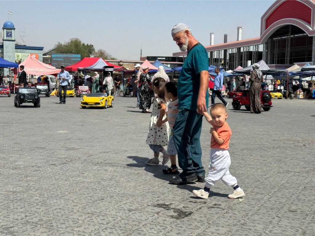 Tras una etapa larga llegamos a Khujand, una ciudad hasta la que llegó Alejandro Magno. Hoy la etapa es muy corta y nos damos el lujo de conocer el mercado. Por el laberinto de puestos se escucha un sonido constante que se acerca poco a poco. Primero es una madre con un niño pequeño de la mano que camina con unas zapatillas con sonido. Coincide que vamos a los mismos puestos y nos acompañan los pequeños pasitos. No le grabo en ese momento. Pero luego en la plaza principal escuchamos en la distancia como se acerca. Esta vez va de la mano de un señor y llena la plaza con sus pasitos sonoros.
